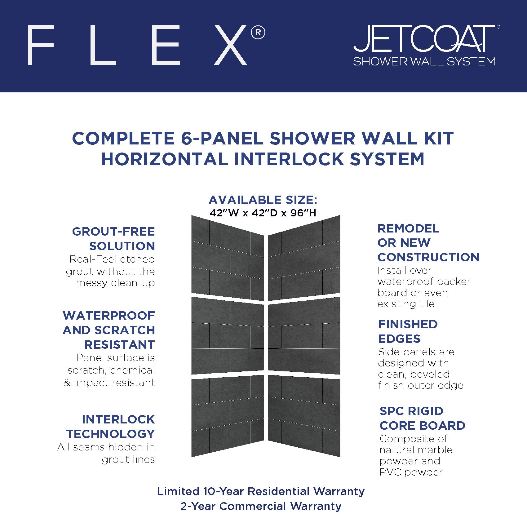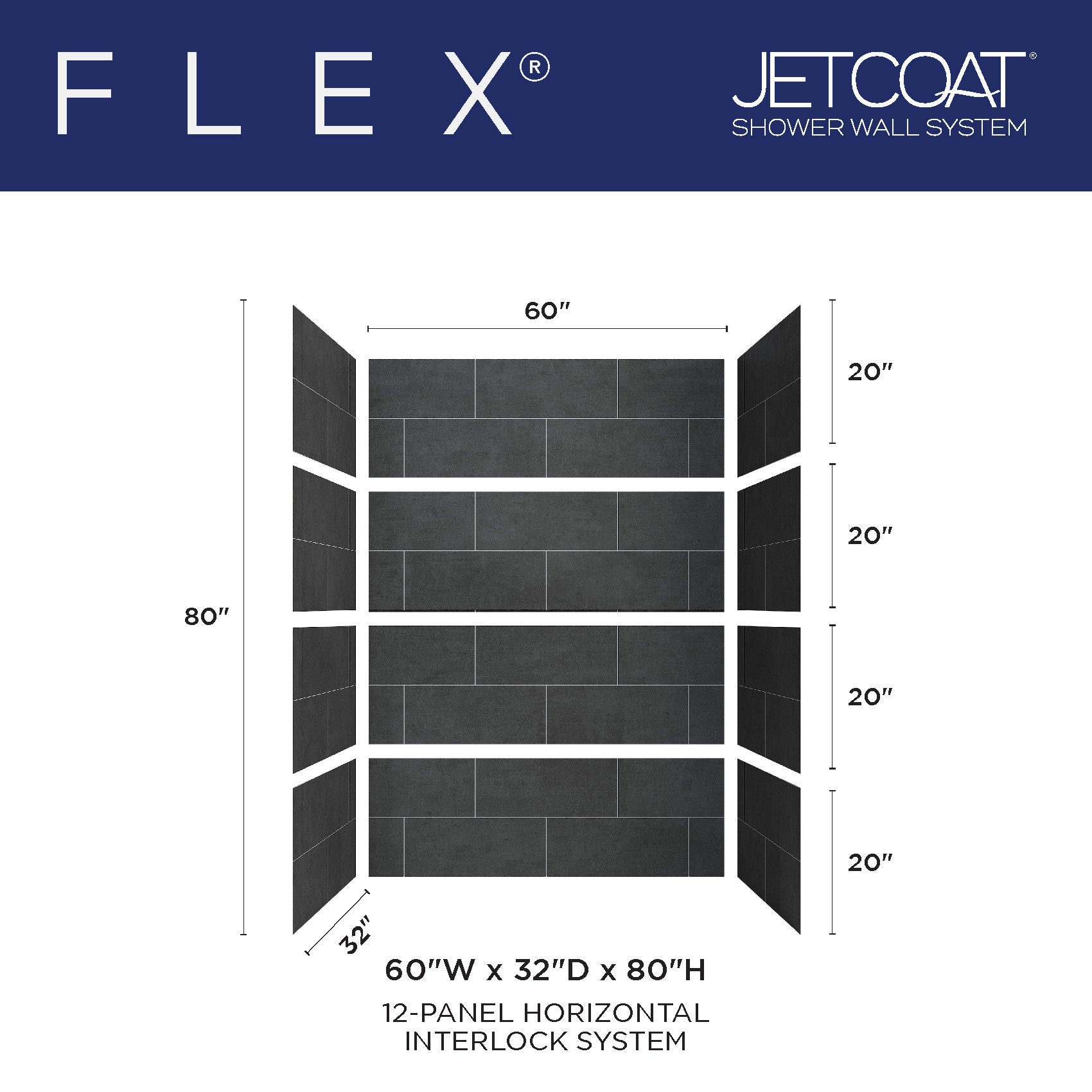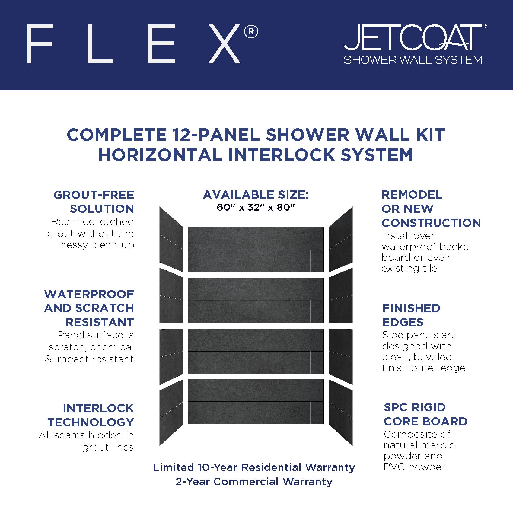 CRAFT + MAIN® JETCOAT® FLEX®, featuring a contemporary tile design patterns with Real-Feel etched grouted tiles, eliminates the mess and time-consuming installation process of real tile. Horizontal panels with Interlocking Technology create easy, waterproof installation, while the horizontal interlocking grout lines conveniently hide the panel-lock seams. FLEX® panels are lightweight and easily cut for a custom fit, with a beveled outside edge providing a sleek, finished look. Each waterproof panel is layered with a top clear coat that has multiple protective UV layers for wear and stain resistance. FLEX® Shower Wall Systems are available in Neo-Angle, Tub, and Shower layouts. It’s not just the upscale feel the shower system promises; it’s the longevity, durability, and ease of upkeep for years to come. For a more striking design, our accent panels sold separately, can be added to create an intriguing and sophisticated shower aesthetic in an otherwise simple bathroom.