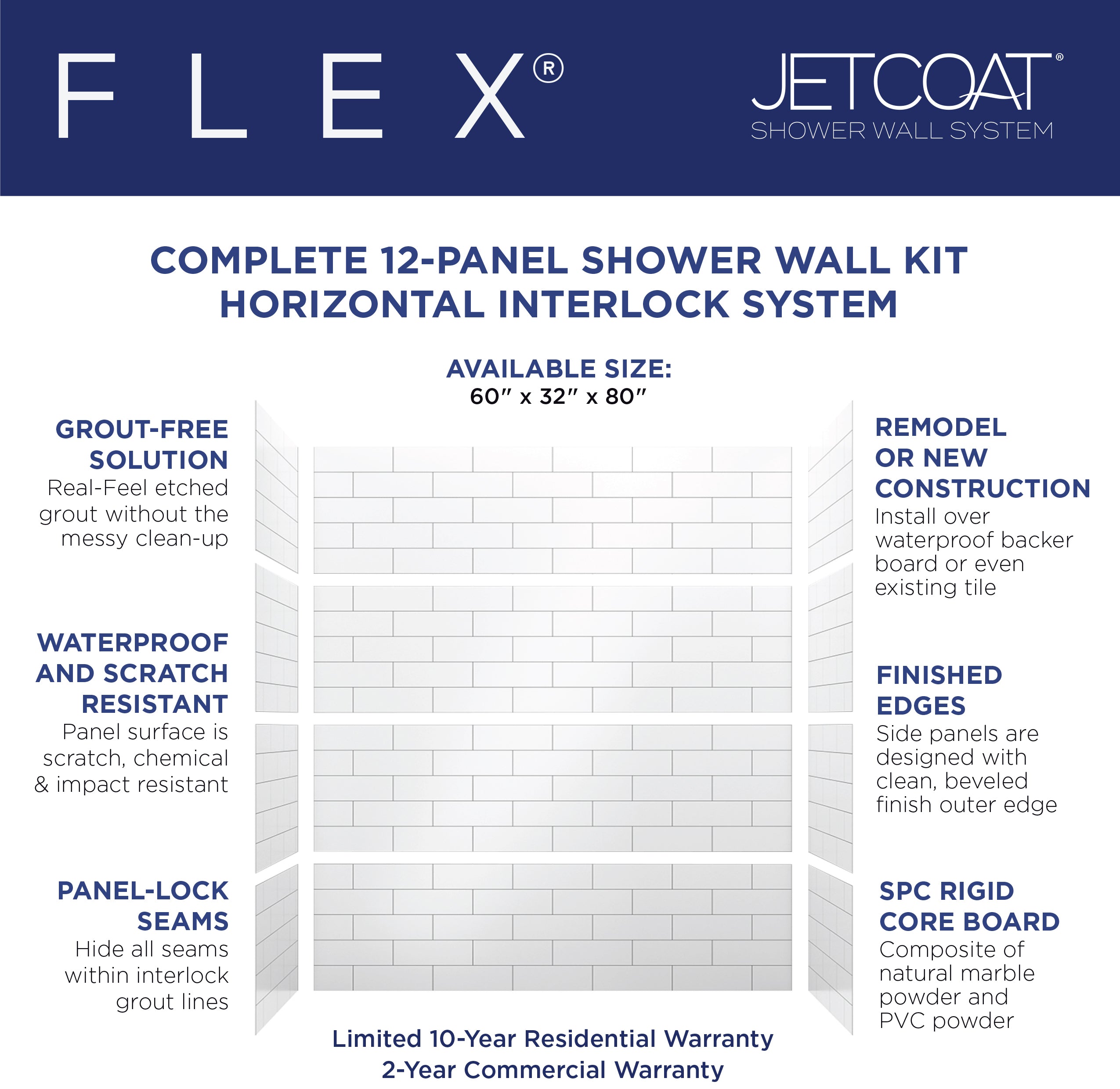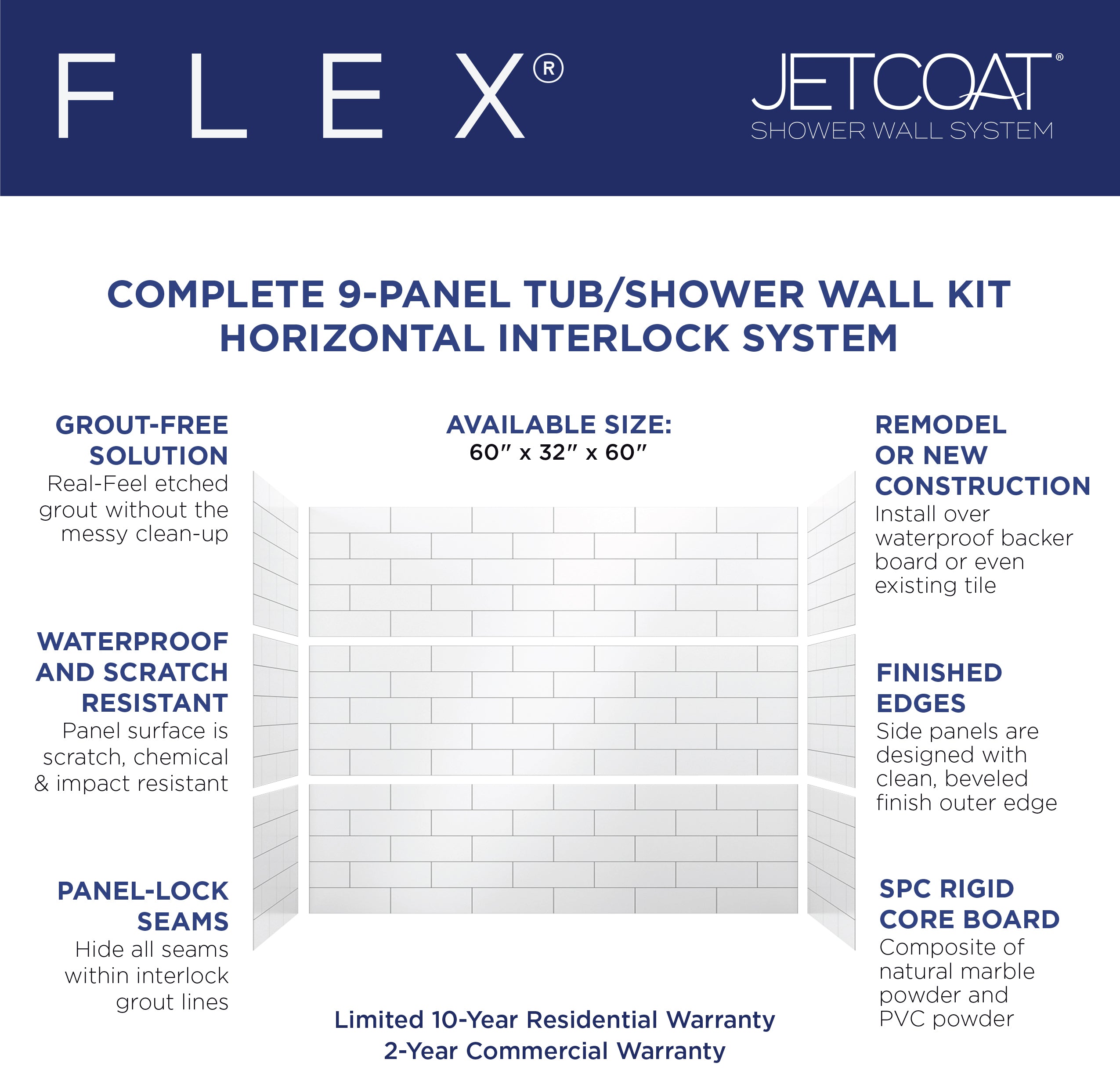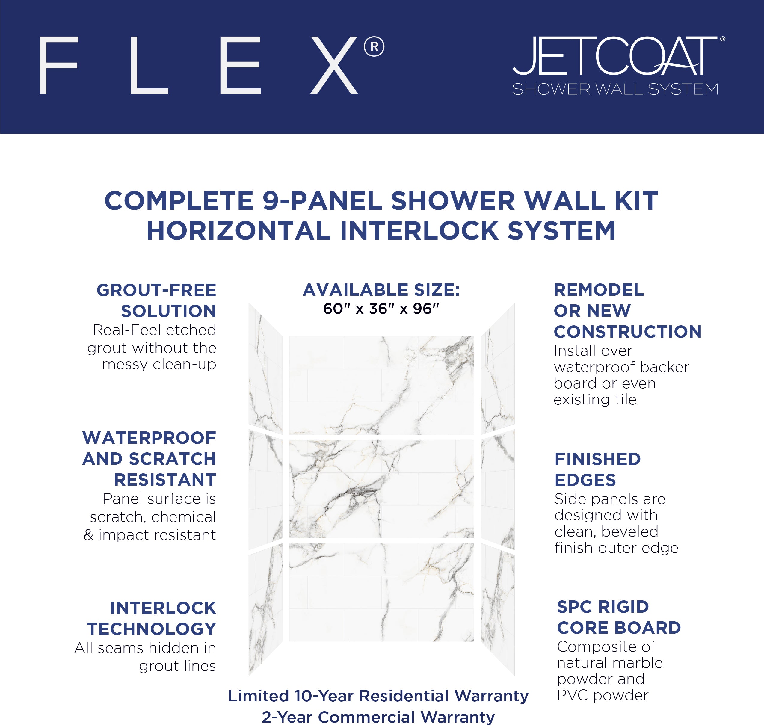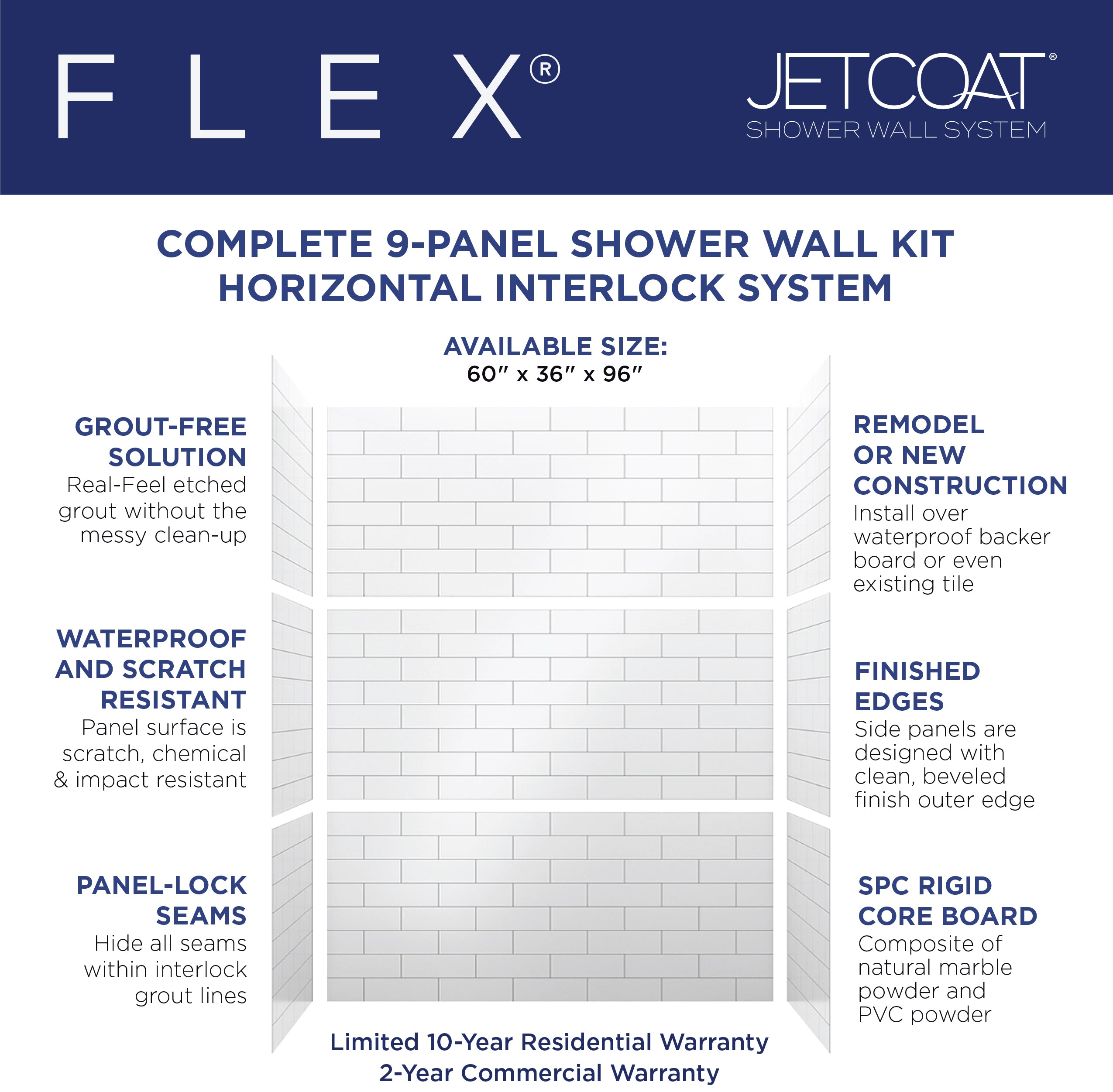 CRAFT + MAIN® JETCOAT® FLEX®, featuring a contemporary tile design patterns with Real-Feel etched grouted tiles, eliminates the mess and time-consuming installation process of real tile. Horizontal panels with Interlocking Technology create easy, waterproof installation, while the horizontal interlocking grout lines conveniently hide the panel-lock seams. FLEX® panels are lightweight and easily cut for a custom fit, with a beveled outside edge providing a sleek, finished look. Each waterproof panel is layered with a top clear coat that has multiple protective UV layers for wear and stain resistance. FLEX® Shower Wall Systems are available in Neo-Angle, Tub, and Shower layouts. It’s not just the upscale feel the shower system promises; it’s the longevity, durability, and ease of upkeep for years to come. For a more striking design, our accent panels sold separately, can be added to create an intriguing and sophisticated shower aesthetic in an otherwise simple bathroom.