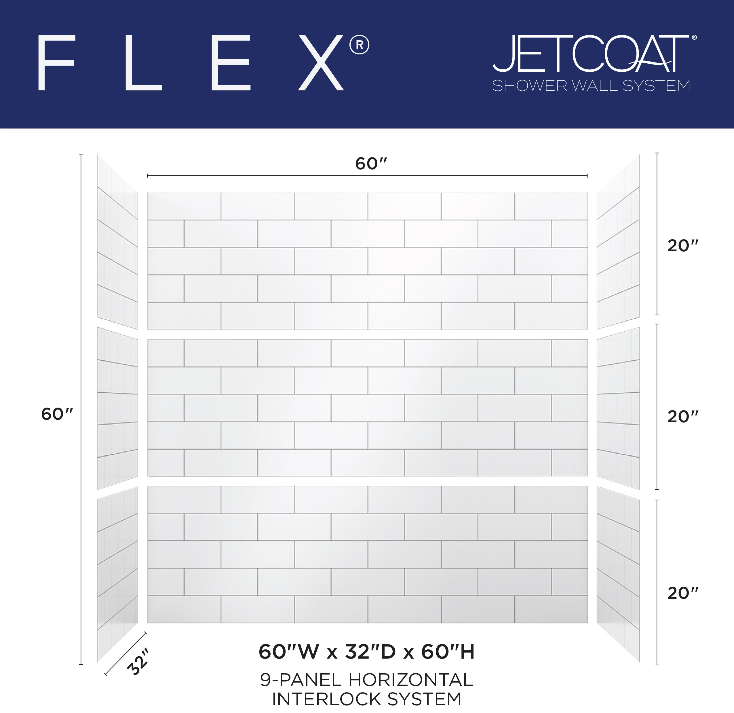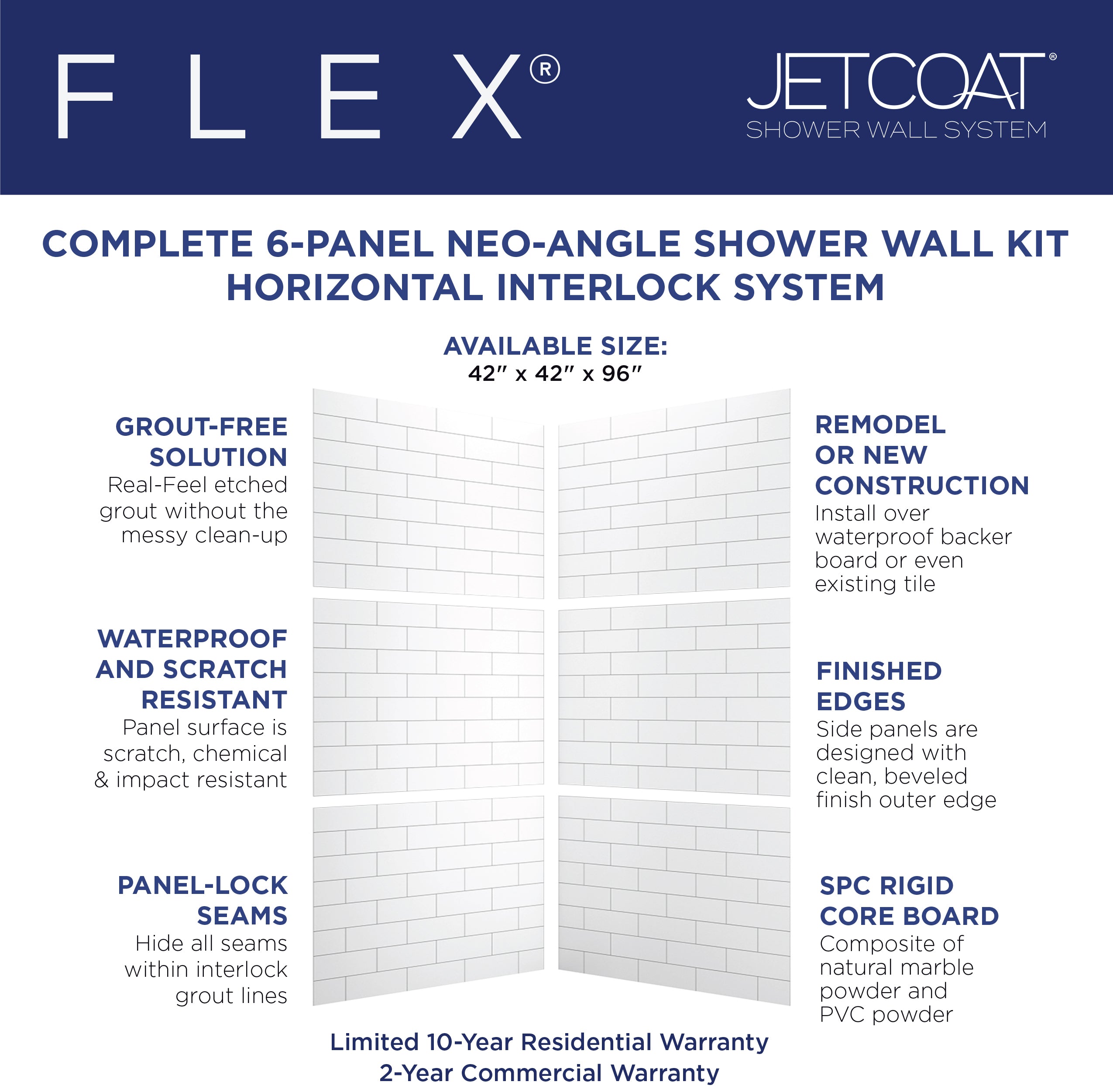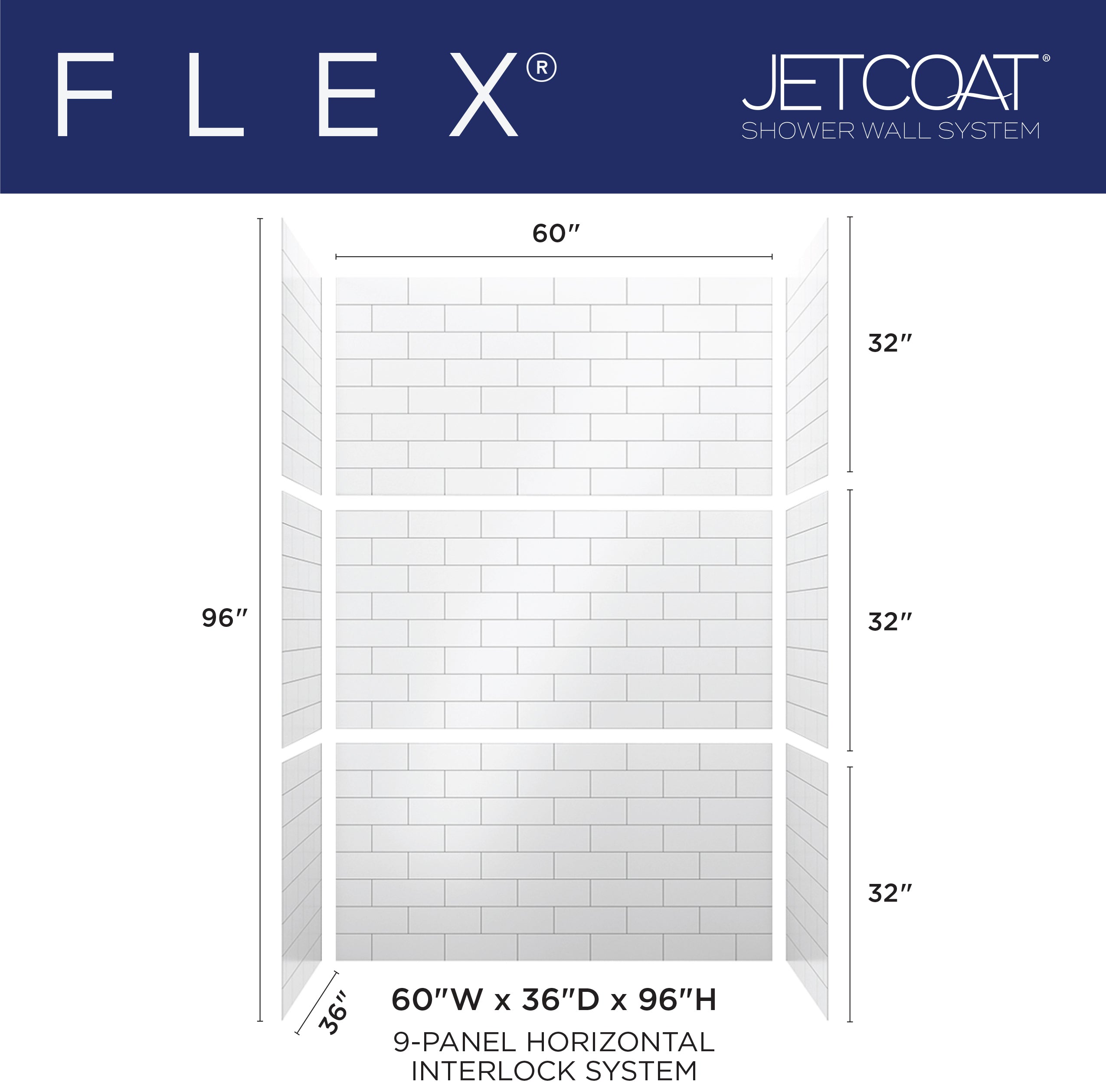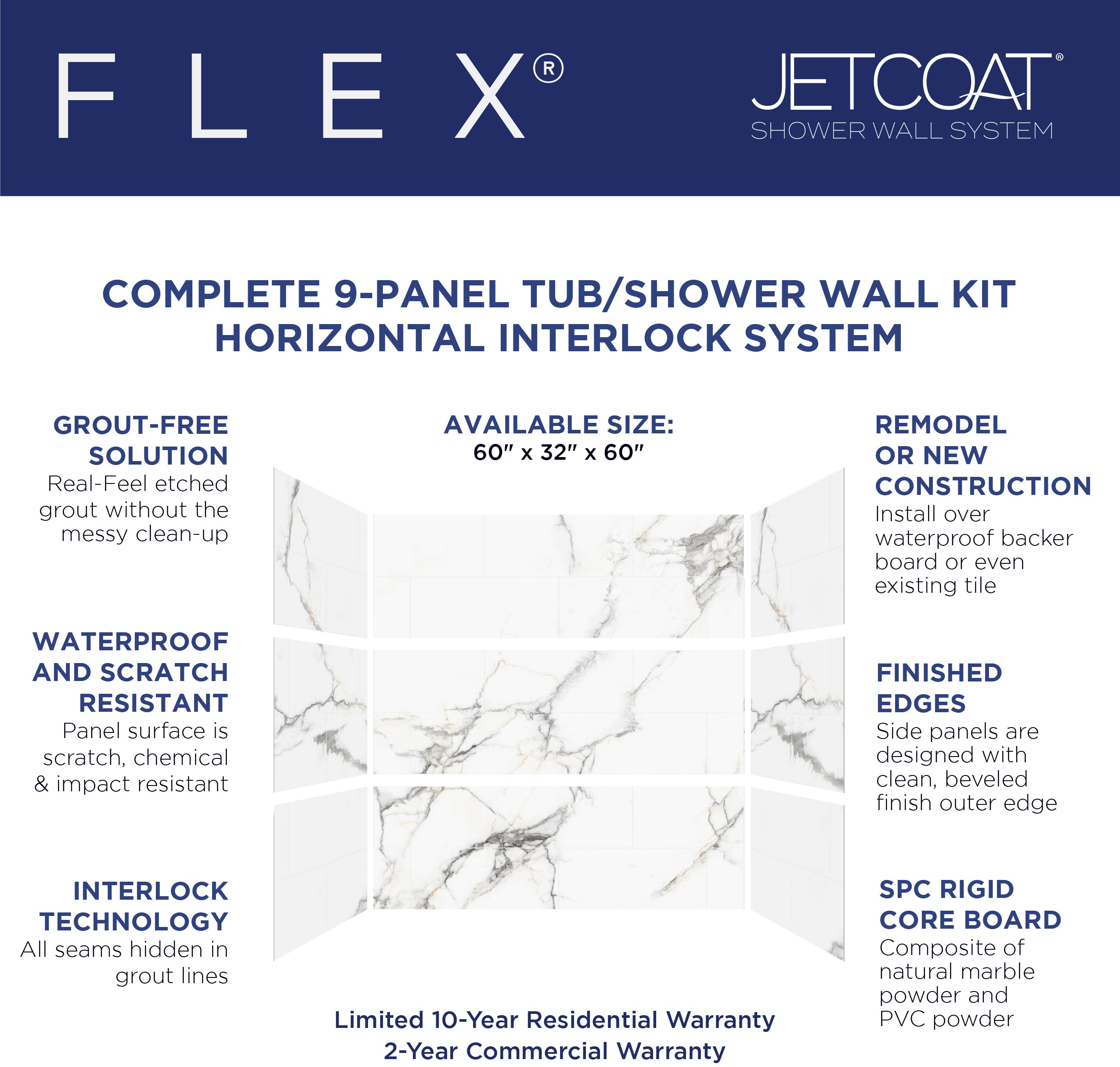 CRAFT + MAIN® JETCOAT® FLEX®, featuring a contemporary tile design patterns with Real-Feel etched grouted tiles, eliminates the mess and time-consuming installation process of real tile. Horizontal panels with Interlocking Technology create easy, waterproof installation, while the horizontal interlocking grout lines conveniently hide the panel-lock seams. FLEX® panels are lightweight and easily cut for a custom fit, with a beveled outside edge providing a sleek, finished look. Each waterproof panel is layered with a top clear coat that has multiple protective UV layers for wear and stain resistance. FLEX® Shower Wall Systems are available in Neo-Angle, Tub, and Shower layouts. It’s not just the upscale feel the shower system promises; it’s the longevity, durability, and ease of upkeep for years to come. For a more striking design, our accent panels sold separately, can be added to create an intriguing and sophisticated shower aesthetic in an otherwise simple bathroom.