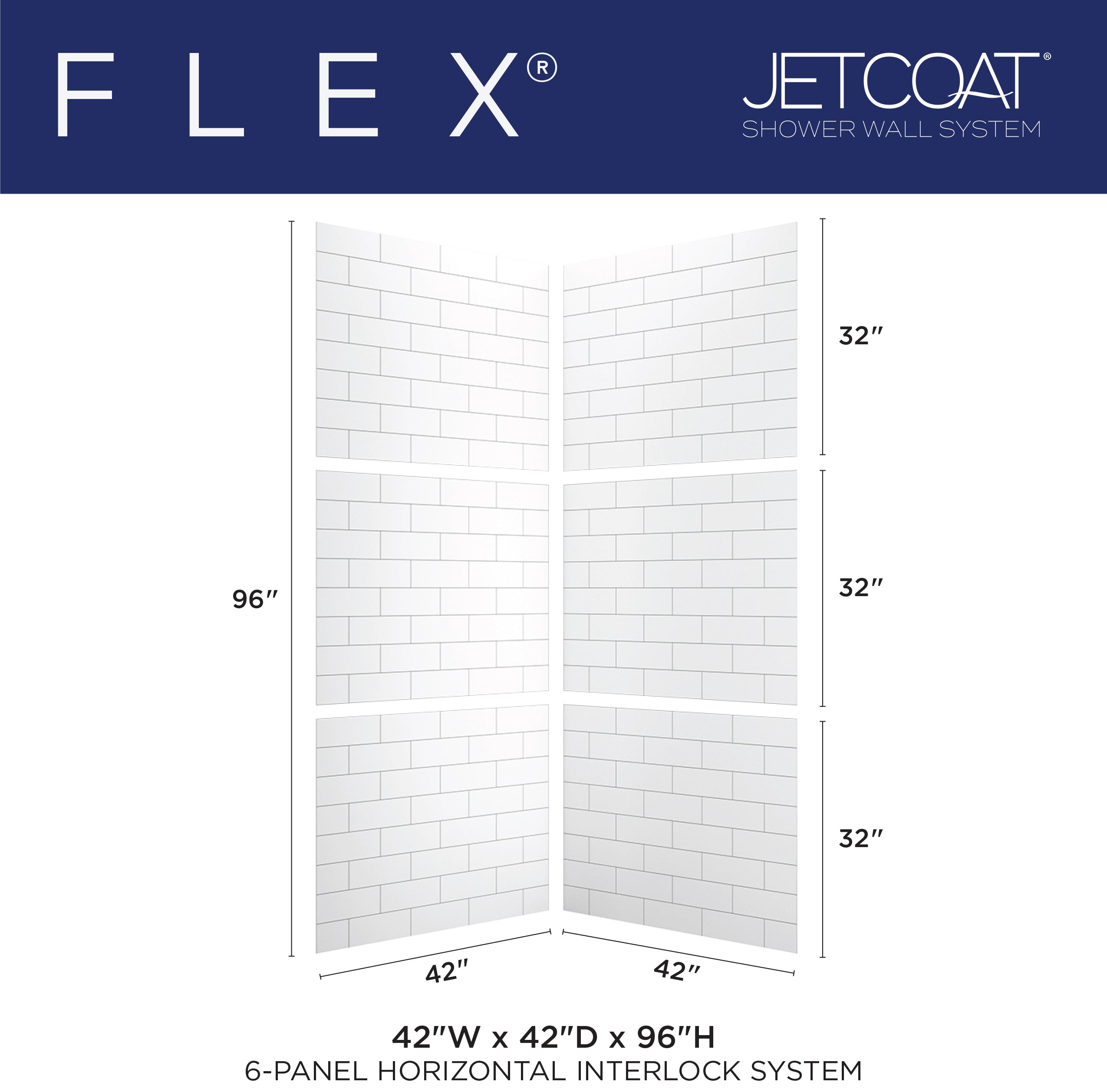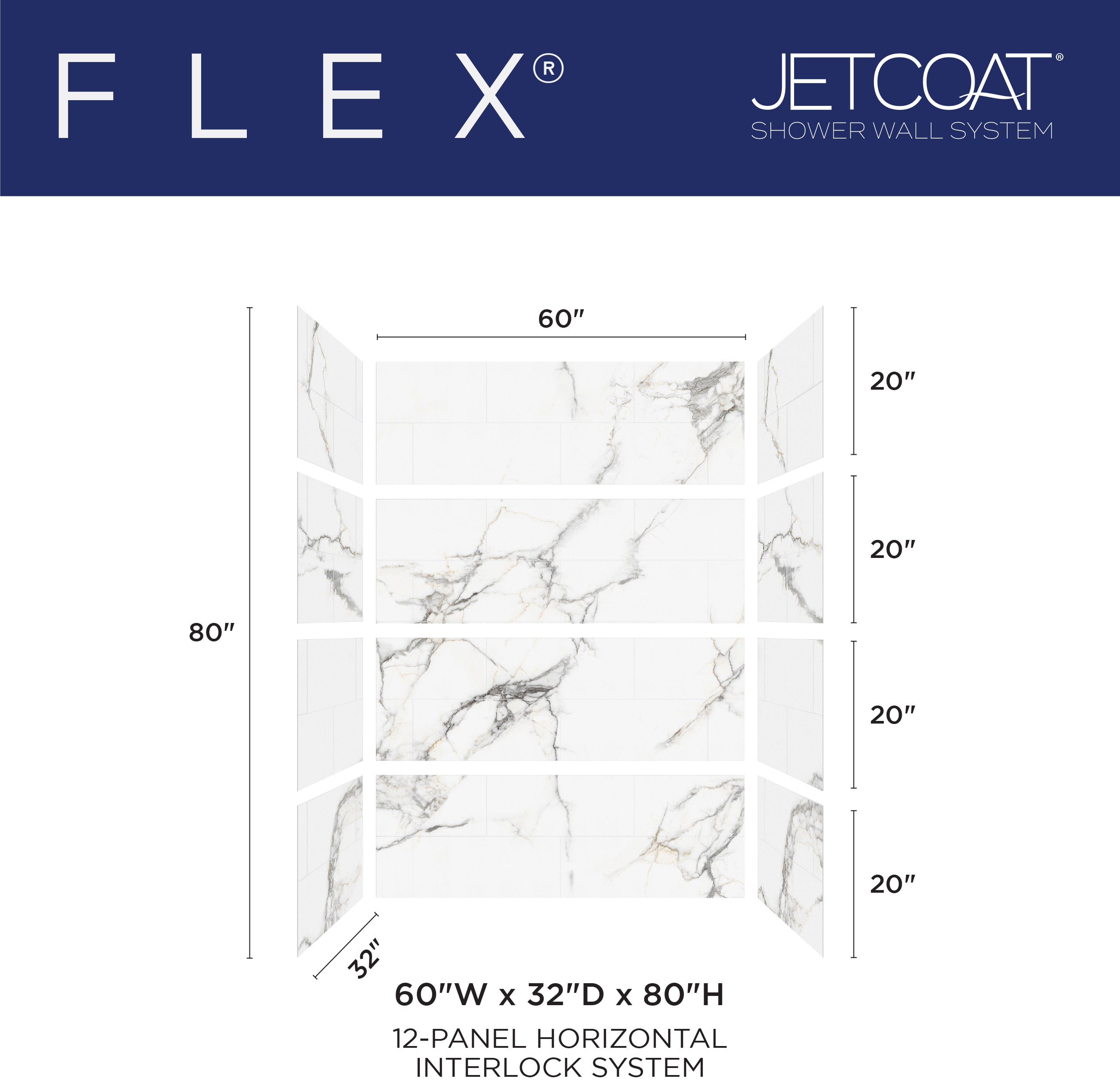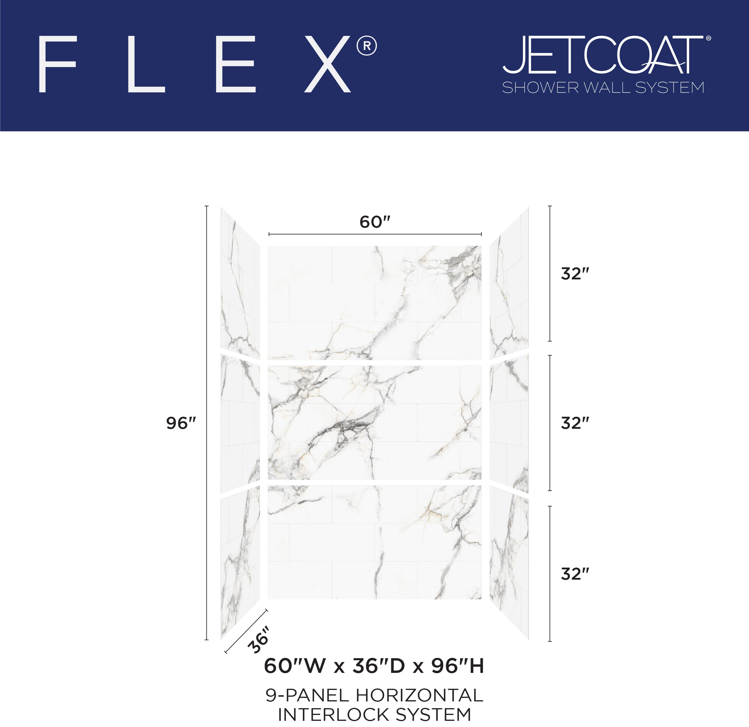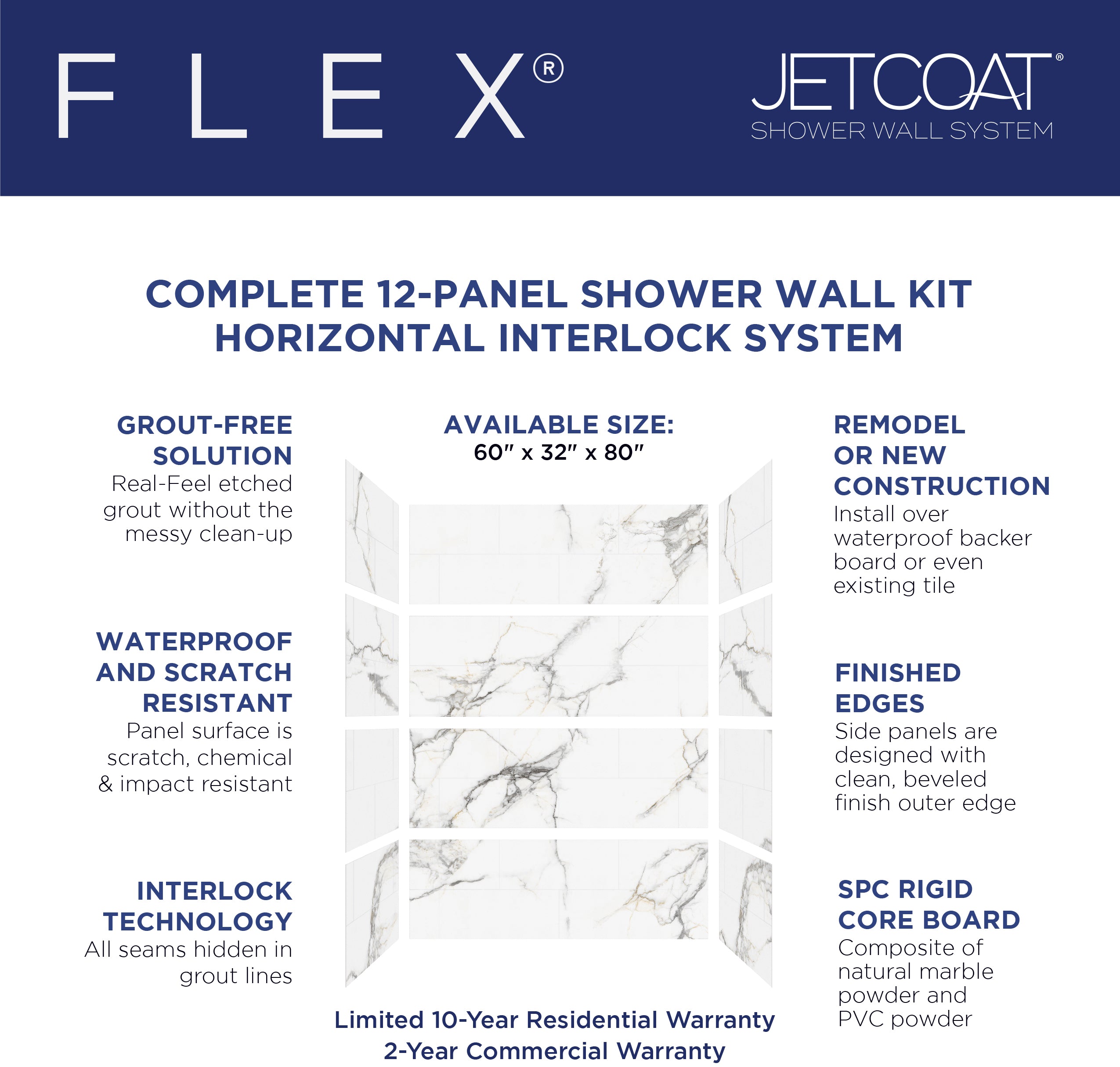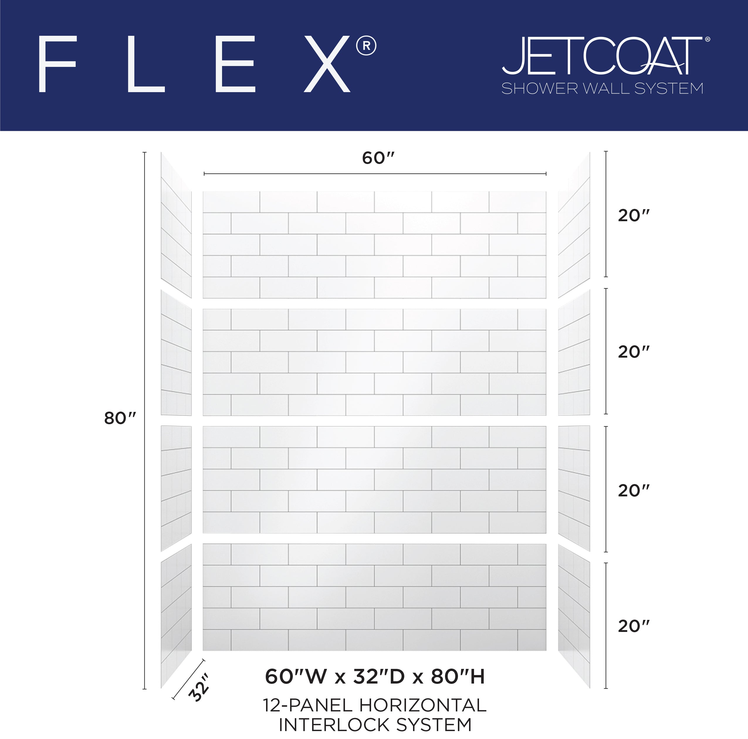 CRAFT + MAIN® JETCOAT® FLEX®, featuring a contemporary tile design patterns with Real-Feel etched grouted tiles, eliminates the mess and time-consuming installation process of real tile. Horizontal panels with Interlocking Technology create easy, waterproof installation, while the horizontal interlocking grout lines conveniently hide the panel-lock seams. FLEX® panels are lightweight and easily cut for a custom fit, with a beveled outside edge providing a sleek, finished look. Each waterproof panel is layered with a top clear coat that has multiple protective UV layers for wear and stain resistance. FLEX® Shower Wall Systems are available in Neo-Angle, Tub, and Shower layouts. It’s not just the upscale feel the shower system promises; it’s the longevity, durability, and ease of upkeep for years to come. For a more striking design, our accent panels sold separately, can be added to create an intriguing and sophisticated shower aesthetic in an otherwise simple bathroom.