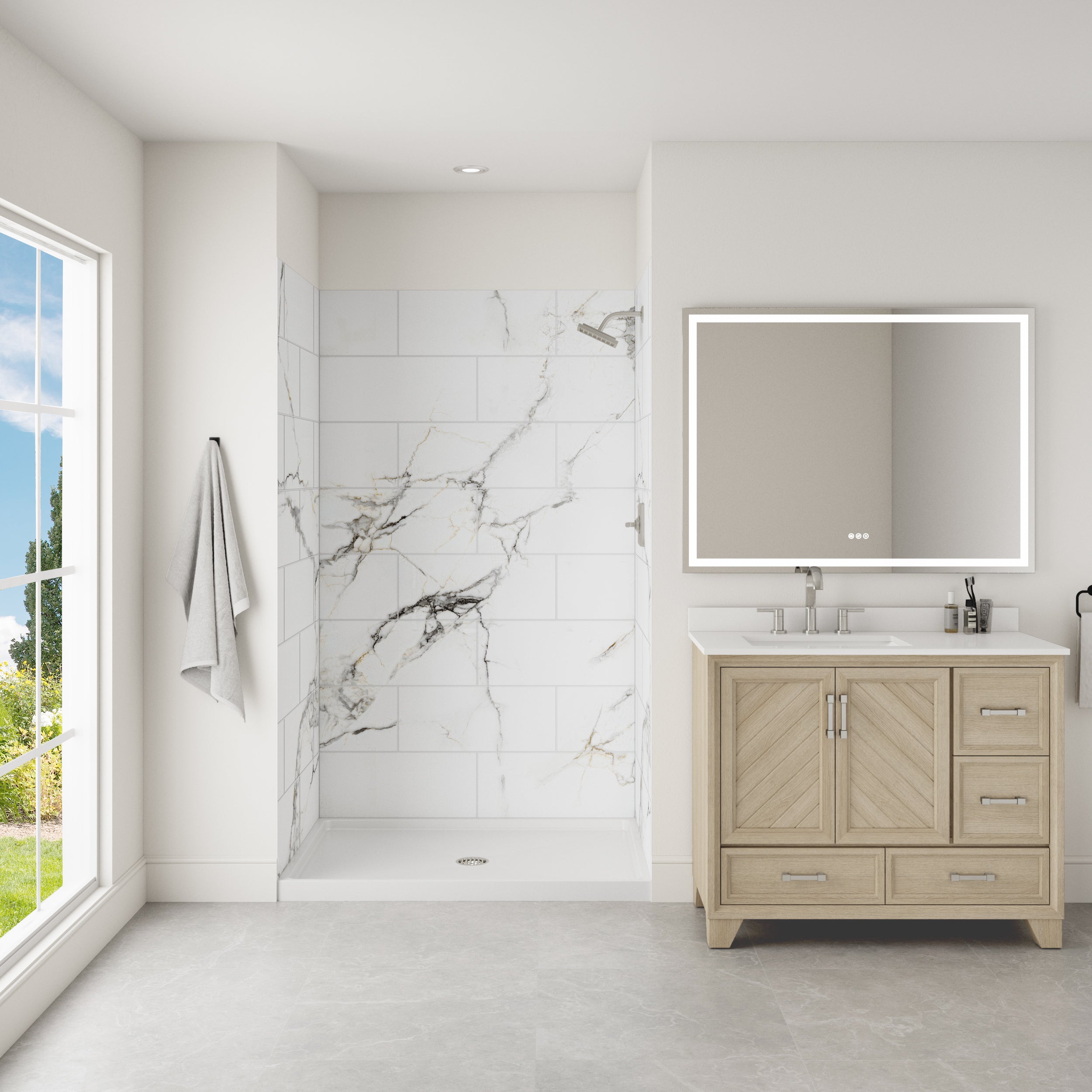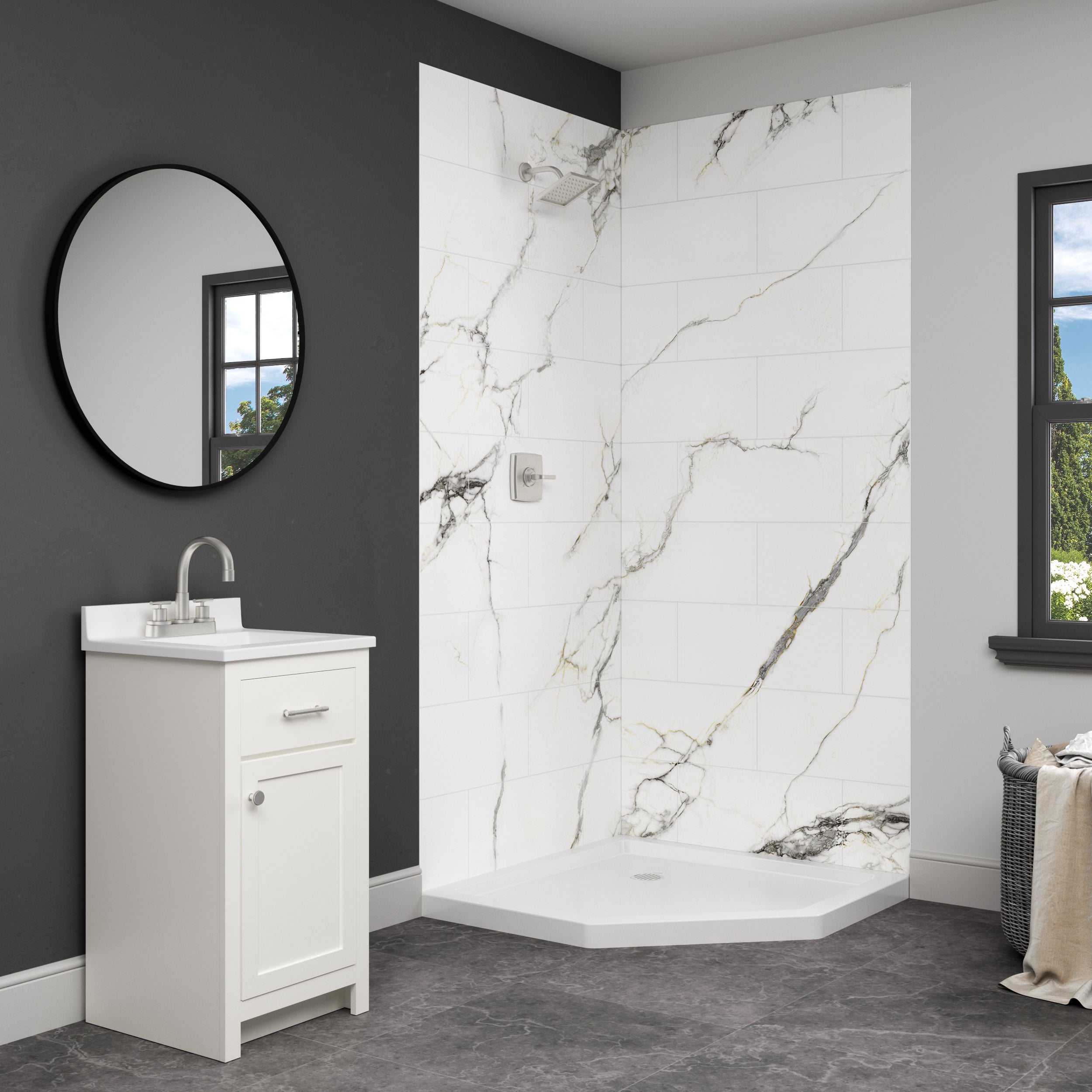 FLEX® panels are lightweight and easily cut for a custom fit, with a beveled outside edge providing a sleek, finished look. Each waterproof panel is layered with a top clear coat that has multiple protective UV layers for wear and stain resistance. For a more striking design, Accent Panels, sold separately, can be added to create an intriguing and sophisticated shower aesthetic in an otherwise simple bathroom. It’s not just the upscale feel the shower system promises; it’s the longevity, durability, and ease of upkeep for years to come.