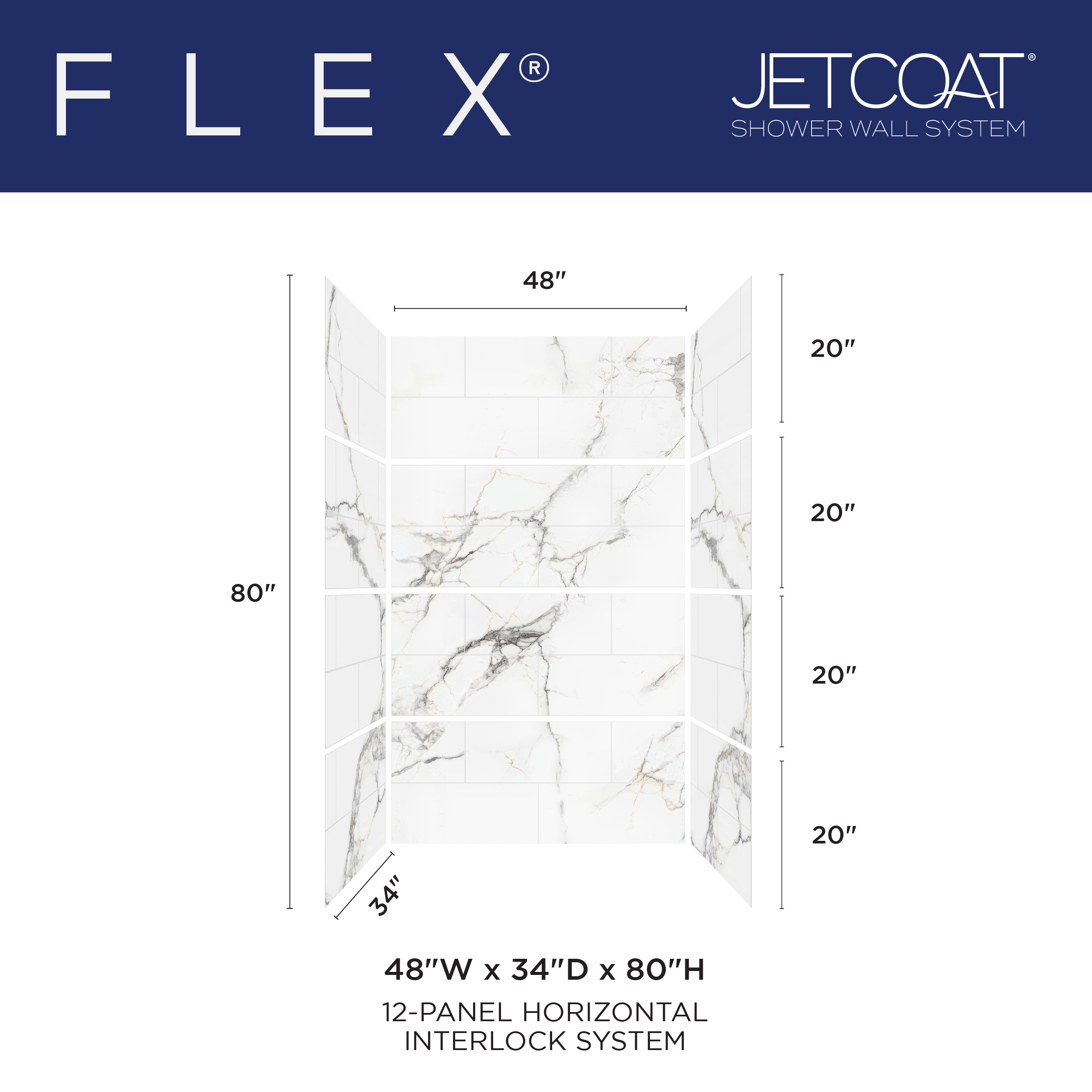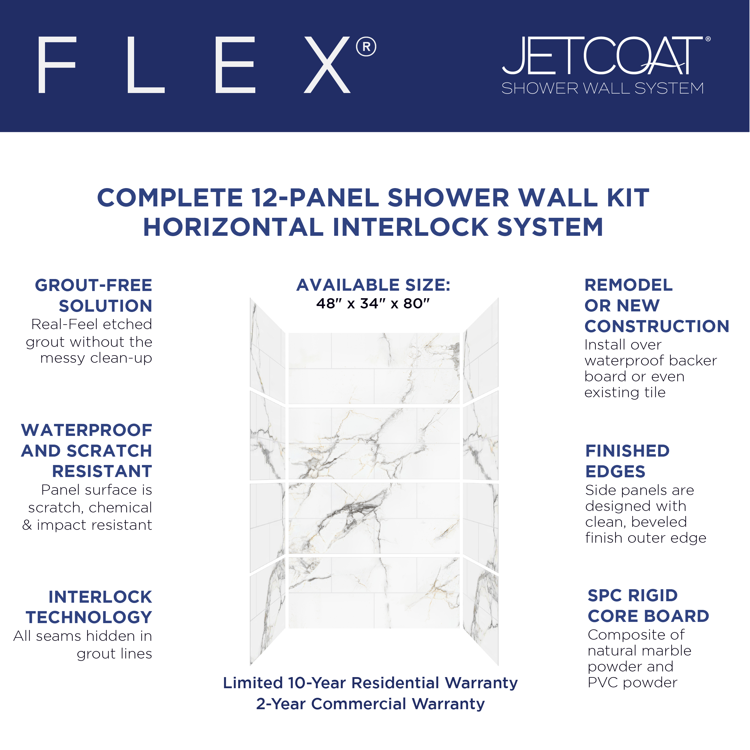 CRAFT + MAIN JETCOAT® FLEX®, featuring contemporary finishes with Real-Feel etched grouted tiles, eliminates the mess and time-consuming installation process of real tile. Horizontal panels with Interlocking Technology create easy, waterproof installation, while the horizontal interlocking grout lines conveniently hide the panel-lock seams.